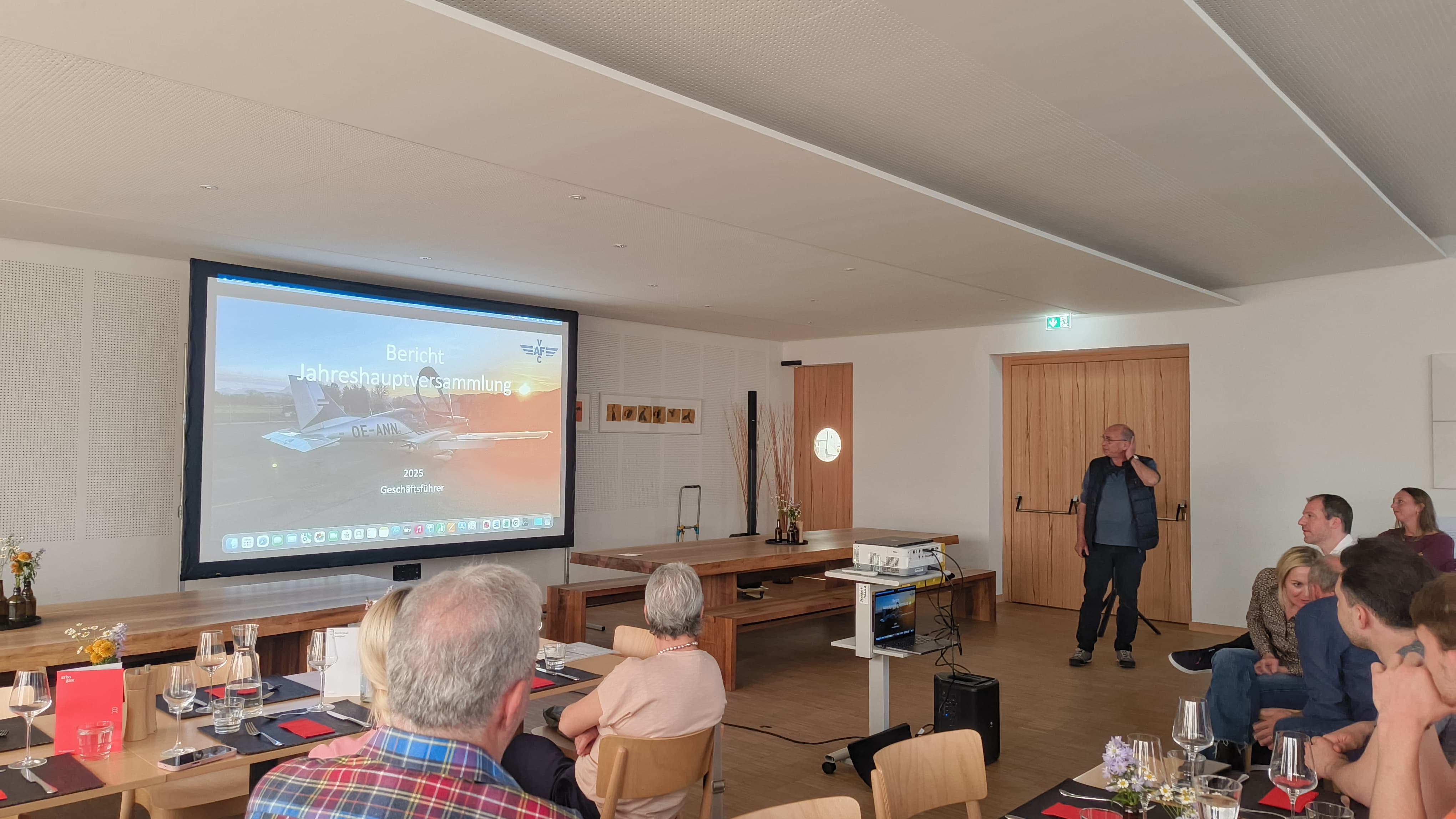 Am 18. April traf sich der VAFC im Bildungshaus St. Arbogast zur diesjährigen Jahreshauptversammlung. Es war ein besonderer Abend, denn Michael Koenitz, der den Verein über viele Jahre hinweg als Geschäftsführer und Flugschulleiter geprägt hat, berichtete heuer zum letzten Mal in dieser Funktion. Dieser Moment war für viele – und ganz besonders für Micha selbst – sehr emotional. Als Zeichen des großen Dankes für seinen langjährigen, unermüdlichen Einsatz erhielt er von den rund 60 anwesenden Vereinsmitgliedern stehenden Applaus.